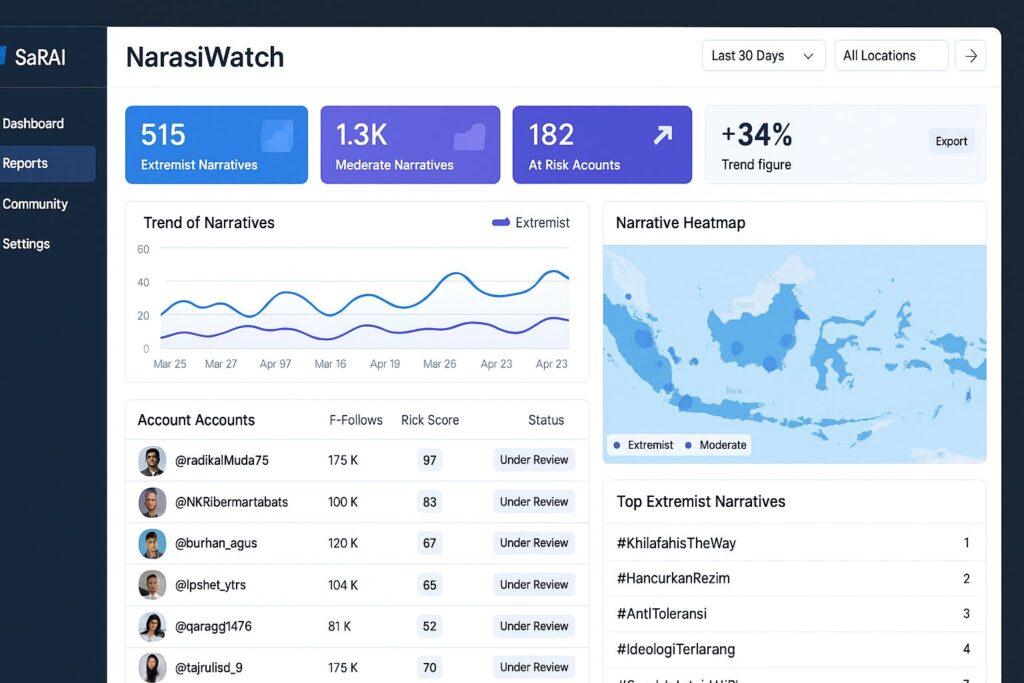 NarasiWatch adalah fitur unggulan SaRAI yang memungkinkan kamu melacak narasi digital yang berpotensi ekstrem, mendeteksi akun penyebar, dan melihat sebaran geografis secara langsung melalui dashboard interaktif berbasis AI.