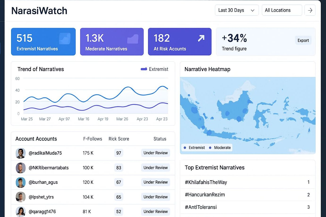 Pantau tren narasi ekstremisme digital, akun rawan, dan sebaran geografis secara real-time.